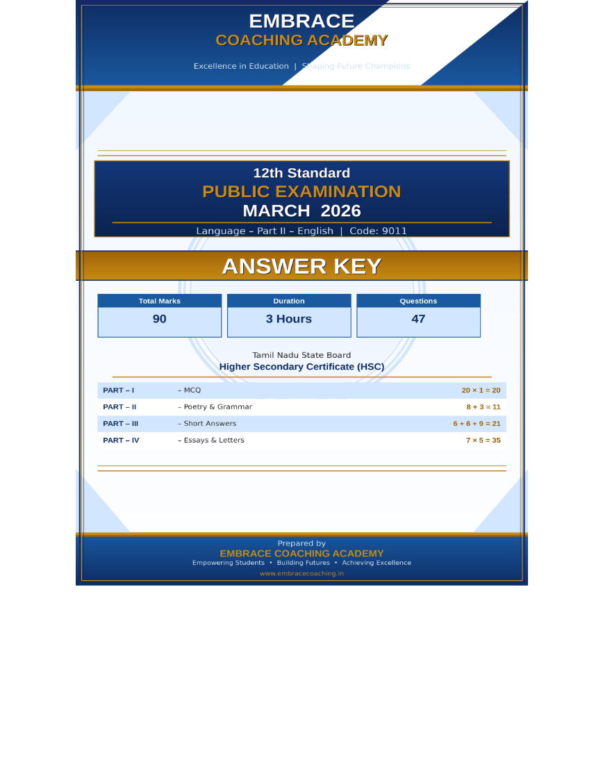 TNSB - 12th English- 2026 Board Exam Question paper - Answer Key